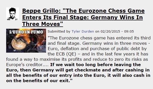 "La partita a scacchi dell’Eurozona è entrata nella sua terza e ultima fase. La Germania ne esce vincitrice in tre mosse - Euro, deflazione e acquisti di debito pubblico da parte della BCE (QE) – con cui in questi anni ha saputo massimizzare i suoi profitti e azzerare i suoi rischi di creditore d’Europa.