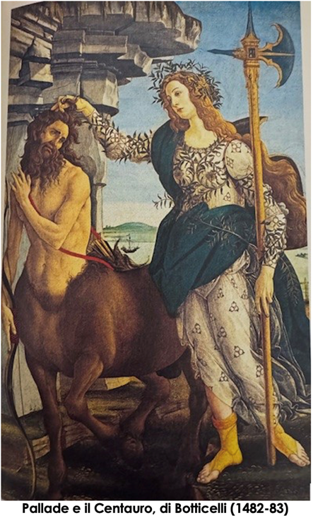 Nel dipinto, Pallade domina pienamente la violenza del Centauro – qui privato di astuzia, un attributo della volpe, come descrisse Machiavelli. Ma come in tutto ciò che riguarda Botticelli, il gesto della dea – tirare i capelli alla bestia – è piuttosto ambiguo. Non la domina solo con la semplice persuasione o l'arte della retorica sottile. Pallade/Minerva qui è molto più forte – e persino pronta a decapitare il centauro con il suo piccone.