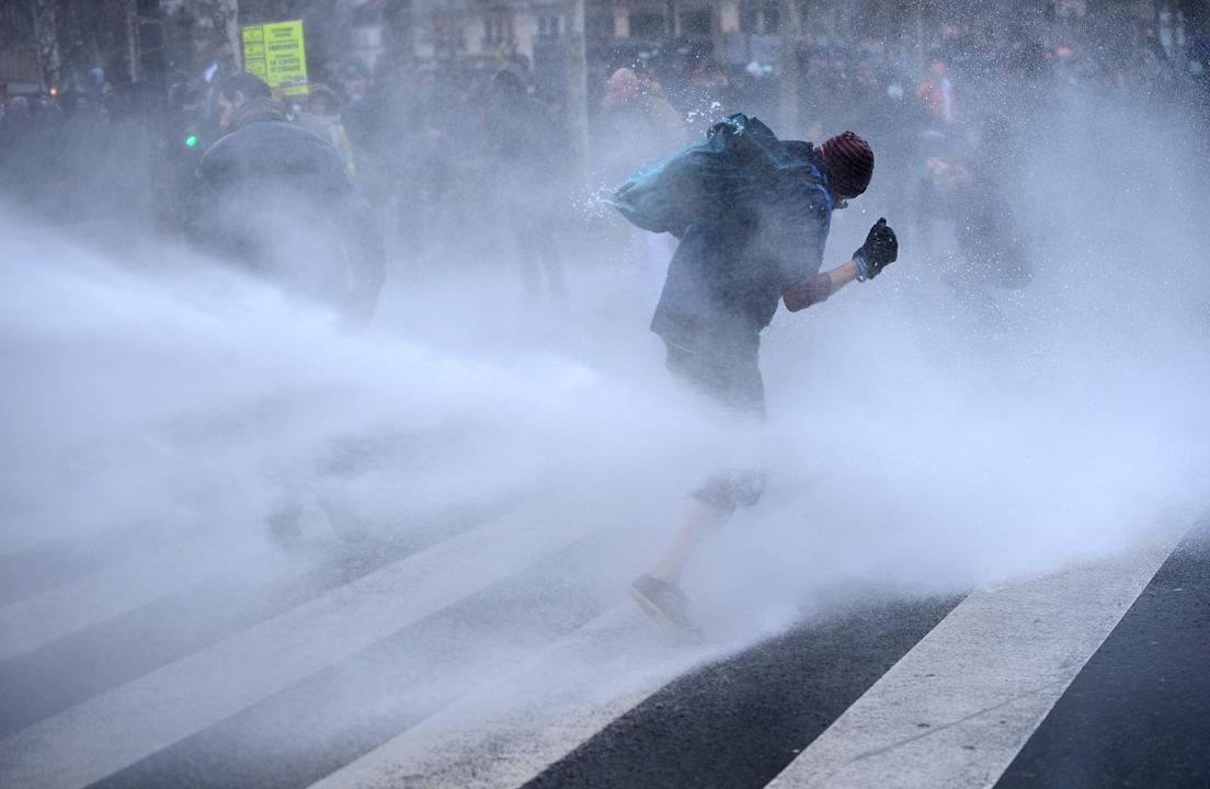 Dopo i manganelli, la polizia francese, non paga, ha usato anche i cannoni d'acqua per disperdere i manifestanti.