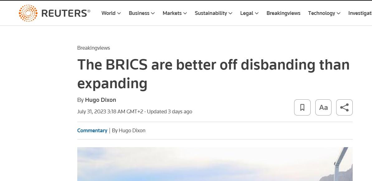 Un’articolo pubblicato oggi sul sito della Reuters titola: “Piuttosto che espandersi, è meglio che i Brics si sciolgano”. (https://www.reuters.com/breakingviews/brics-are-better-off-disbanding-than-expanding-2023-07-31/)