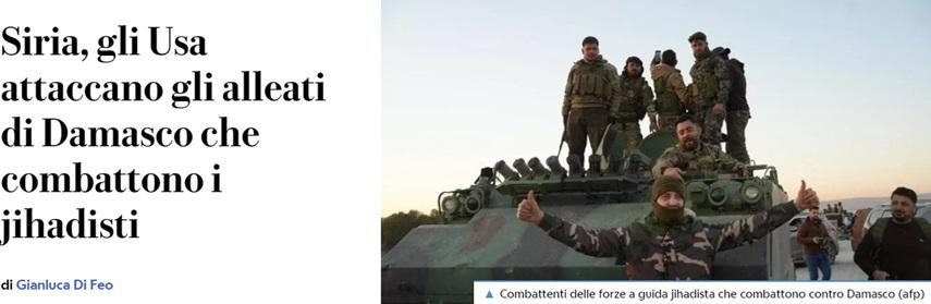 Miracolo nella redazione di Repubblica! Titolo in Home Page: “Siria, gli Usa attaccano gli alleati di Damasco che combattono i jihadisti”. Al quale fa eco la dichiarazione del ministro Taiani (che, pure mesi fa, chiedeva un ripensamento sulla criminalizzazione di Assad riaprendo l’ambasciata italiana a Damasco) che ora, con migliaia di tagliagole che tentano di rioccupare la Siria, si limita a condannare il fantomatico “raid aereo russo” contro un convento dei Francescani ad Aleppo.