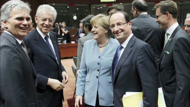 Il 29 è "in gioco l'Europa". Nel vertice di venerdì a villa Madama con il presidente francese Hollande, il premier spagnolo Rajoy e la cancelliera tedesca Merkel, il presidente del Consiglio italiano Mario Monti cercherà di preparare il terreno per il vertice Ue del 28 e 29 giugno, a Bruxelles, che deciderà definitivamente le sorti dell'integrazione europea. In una intervista a La Stampa e altri cinque quotidiani europei (Le Monde, El Pais, Suddetsche Zeitung, The Guardian e Gazeta Wyborcza), Monti ha provato a tranquillizzare il cittadino medio tedesco,sottolineando come ai Paesi virtuosi servirebbe uno "scivolo" verso un mercato più sostenibile in termini di tassi d'interesse. In caso di risposta debole davanti alla crisi, si avrebbe non solo un "accanimento speculativo anche verso Paesi meno deboli, come l'Italia", ma ci sarebbe la possibilità di rigetto nei confronti dell'Europa stessa, rischio che si intravede "persino nel nostro Parlamento". Nel suo pressing sulla "cancelliera di ferro", Monti conta sull'alleanza con Parigi e Madrid. Francia e Spagna, infatti, dovrebbero appoggiare la proposta italiana di utilizzare il fondo salva stati europeo per acquisti calmieranti di titoli di stato sotto pressione. Un meccanismo di controllo sulle impennate dei rendimenti e dei loro differenziali rispetto ai bund tedeschi, i famigerati "spread". Ma finora Berlino si è mostrata decisamente fredda. E a complicare il quadro, in vista del vertice europeo di fine mese, sembra trovare sponda nella commissione europea.