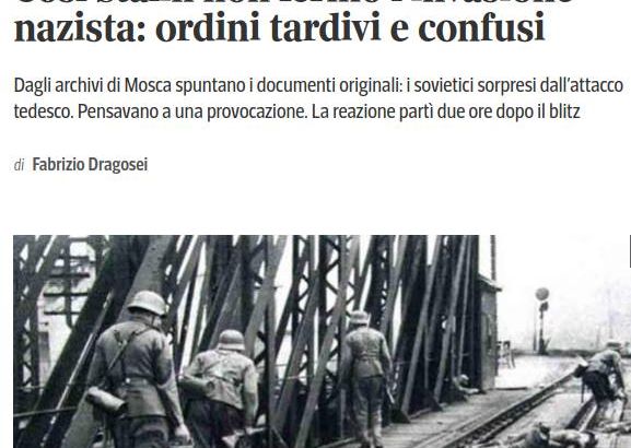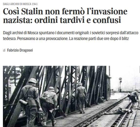 Con un articolo di Fabrizio Dragosei, pubblicato in data 22 giugno 2018 sul sito https://www.corriere.it/esteri/18_giugno_23/ordini-tardivi-confusi-stalin-non-fermo-nazisti-242c4e54-7657-11e8-891d-7017f1270990.shtml, l'intellighenzia borghese italiana compie un attacco storiografico tanto eclatante quanto patetico, in quanto smentito ormai da anni dalla storiografia non asservita agli interessi degli Yankees. Sul perché Fabrizio Dragosei non sia al corrente di tali sviluppi storiografici ragiono nel mio prossimo libro, “Il Totalitarismo “Liberale”. Le tecniche imperialiste per l'egemonia culturale”. Per ora mi limito a far sapere alla Redazione del “Corriere della Sera”, ai docenti, agli studenti (piccoli e grandi) e agli appassionati di Storia contemporanea che possono trovare facilmente una smentita dettagliata alle affermazioni davvero imbarazzanti fatte da Dragosei.