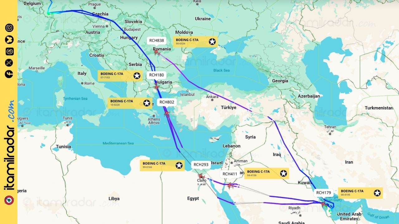 Nella giornata di ieri, 1 aprile 2025, è stato registrato invece un intenso traffico di grandi velivoli da trasporto C-17A Globemaster III di US Air Force tra alcune importanti basi aeree in Europa (in particolare Ramstein, Germania) e lo scalo Al Udeid in Qatar, hub operativo e logistico chiave per le operazioni delle forze armate USA nello scacchiere mediorientale (presenza fino a 10.000 militari e un centinaio di velivoli). E' presumibile che in Qatar siano stati trasferiti sistemi d'arma, munizioni e apparecchiature in vista dell'escalation bellica contro l'Iran.