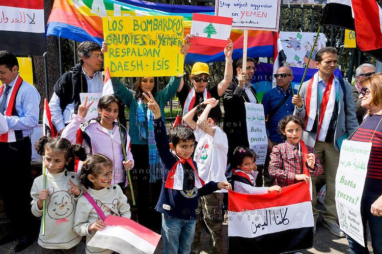 Intere famiglie con bambini piccoli della Comunità yemenita, cittadini di altri paesi arabi e italiani hanno protestato ora (martedì 14) davanti all’ambasciata dell’Arabia saudita a Roma contro i bombardamenti in Yemen da parte della coalizione guidata da Riad. L’aggressione, iniziata il 28 marzo, ha già causato moltissime vittime civili e la distruzione di infrastrutture: nel paese più povero del mondo arabo. “I sauditi sidicono i depositari dell’islam ma uccidono musulmani”.E’ la quarta manifestazione là davanti, dopo la prima di Rete No War sabato 4 aprile. Insieme alle bandiere yemenite e a una - superstite - bandiera della pace italiana, moltissimi cartelli in varie lingue (“Stop al massacro, stop all’aggressione saudita”), foto di civili uccisi dalle bombe, vignette satiriche sul reame sauditae sul presidente yemenita fuggito a Riad. E uno speranzoso “Evviva l’Arabia non saudita”.