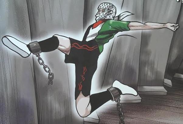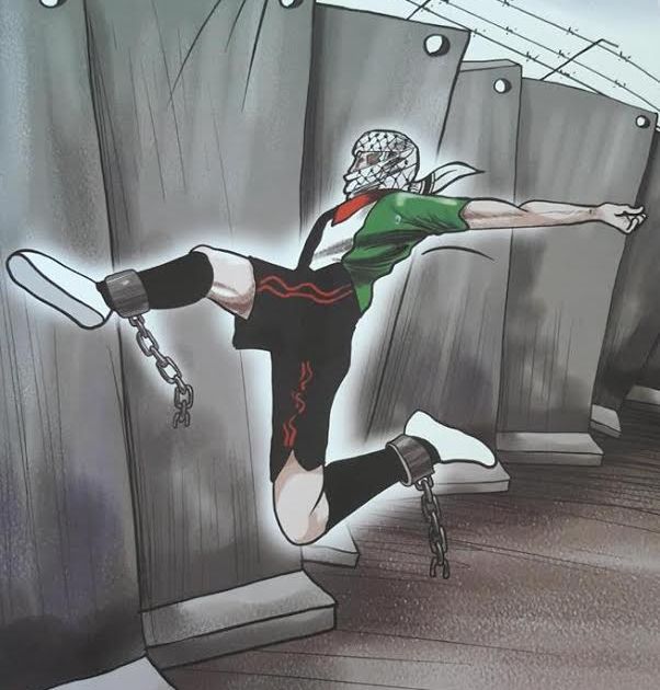 Ma il poster più significativo è senz'altro quello che mostra un calciatore palestinese che riesce a rompere le catene che gli bloccano le caviglie e dà un grande calcio a un pallone che arriva oltre il muro.