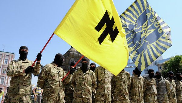 Il Battaglione Azov in posa con un ritratto di Hitler