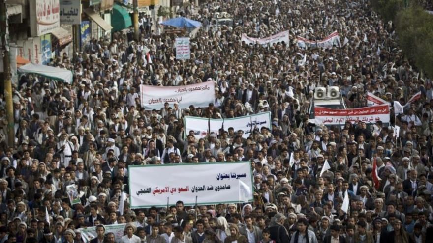 Sotto lo slogan "Noi continueremo la nostra resistenza contro il nemico saudita, sostenuto dagli Stati Uniti" i manifestanti yemeniti hanno protestato contro il regime di Al Saud es i suoi sponsor, gli Stati Uniti e il regime israeliano.